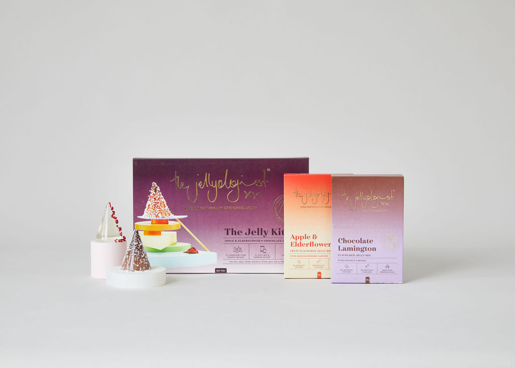 1x The Jellyologist jelly kit with 12 cone-shaped moulds, Apple & Elderflower jelly mix, Chocolate Lamington jelly mix, garnishes and a full set of instructions.
